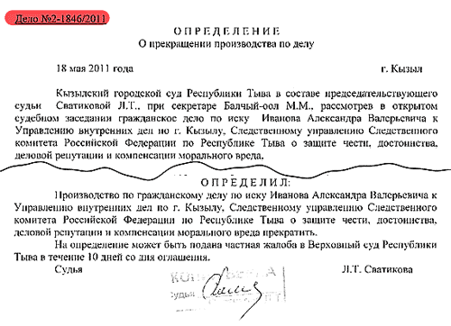 Вот о примере такой судейской шарманки и пойдёт ниже речь, которая прольёт свет на сомнительную судейскую деятельность. В нашем распоряжении оказались документы, проливающие свет на такой «судейский казус». Ранее уже упоминавшийся в нашей газете Кавалеров подал в суд иск о защите чести, достоинства и деловой репутации к УВД г.Кызыла. Одновременно подобный иск был вчинён Ивановым в отношении МВД и Следственного комитета. Иск Кавалерова рассматривался чрезвычайно долго. В конце концов, ответчик Донгак, чья подпись стояла на характеристике Кавалерова, чистосердечно признался, что подпись его на документе кем-то подделана, и он его ранее и в глаза не видел. Подобный скандал возник и в процессе рассмотрения иска Иванова. Судьи Л.Т.Сватикова и В.В.Дулуш находились в состоянии прострации – такого в их практике, судя по всему, ранее не наблюдалось.