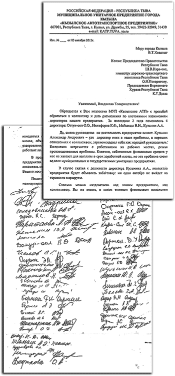 Обращается к Вам коллектив МУП «Кызылское АТП» с просьбой обратиться к коллективу и дать разъяснения по постоянным назначениям директоров нашего предприятия. За последние 2 года поменялись 4 директора: Оттук-оол О.О., Никифоров К.Ф., Майынды В.Н., Кузьмин А.А.