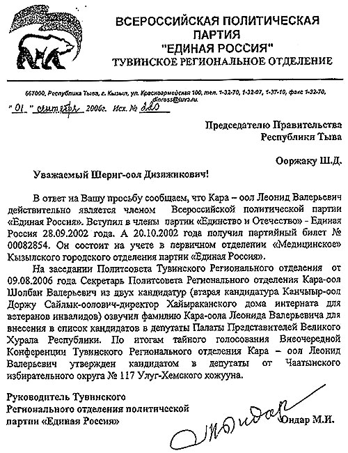 А в сентябре этого года состоящий на партийном учёте в первичном отделении «Медицинское» Кызылского городского отделения партии Леонид Кара-оол, как нам стало известно из СМИ, по итогам внеочередной конференции Тывинского регионального отделения «Единой России» был утверждён кандидатом в депутаты палаты представителей Великого хурала Республики Тыва от Чаатынского избирательного округа №117 Улуг-Хемского кожууна по представлению Шолбана Валерьевича Кара-оола, секретаря политсовета Тывинского регионального отделения «Единой России».
