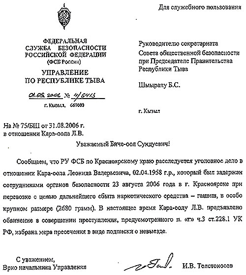 Ещё раз хочется выразить свою поддержку позиции возглавляемой Вами, уважаемый Борис Вячеславович, партии «Единая Россия». Впрочем, эта позиция, выразившаяся в непредвзятой реакции партийных органов на задержание Леонида Кара-оола, вполне объяснима и последовательна для людей, реально думающих о благе государства и борьбе с коррупцией. Ведь именно из Ваших уст в Вашу бытность главой МВД РФ россияне услышали меткий термин «оборотни в погонах», и именно Вы нашли мужество обнародовать преступления, совершённые высокопоставленными офицерами МУРа. Поэтому кому, как не Вам, знать истинную цену признательным показаниям Леонида Кара-оола во время его задержания «с наркотиками в особо крупном размере».