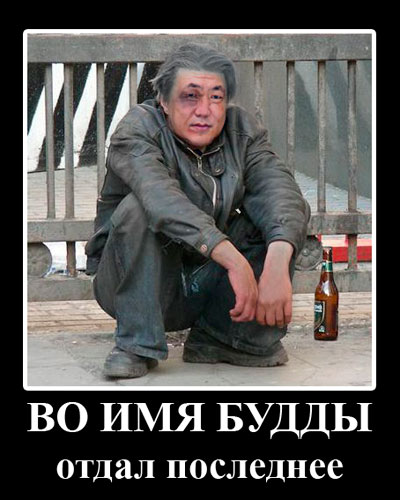ты "умник" давай не отвлекайся от темы...Где ты на этом демотиваторе видишь слова о том, что чел, изображенный там, пропил Будду ради пьянства?? Для меня смысл написанного там сводится к тому, что он ради Будды отдал последнее и стал таким, каким его изобразили - пьянницей и алкашом...При чем тут Будда???