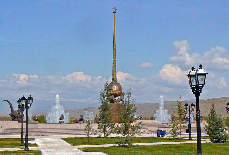 Скульптурная группа «Центр Азии» с обелиском, высокий шпиль которого венчает скифский олень, открылась в Кызыле в дни празднования 100-летия единения Тувы и России.