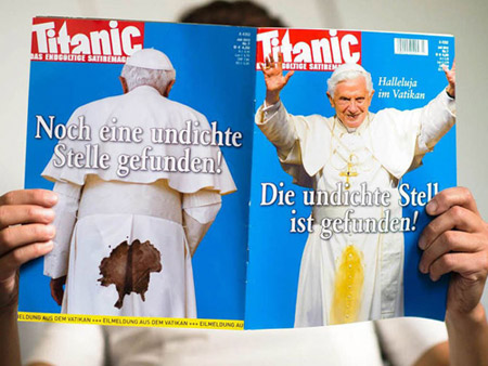 Карикатуры на пап рисовались и раньше. В частности, немецкий сатирический журнал Titanic опубликовал коллаж с предыдущим папой римским, Бенедиктом XVI. На титульной странице издание поместило изображение Бенедикта с огромным желтым пятном на сутане и подписало: «Аллилуйя в Ватикане: место утечки обнаружено!» Номер был посвящен скандалам, в которые оказался втянут Ватикан в прошлом году: от коррупции до педофилии. Ватикан подал в суд на немецкий журнал, однако затем отозвал жалобу.