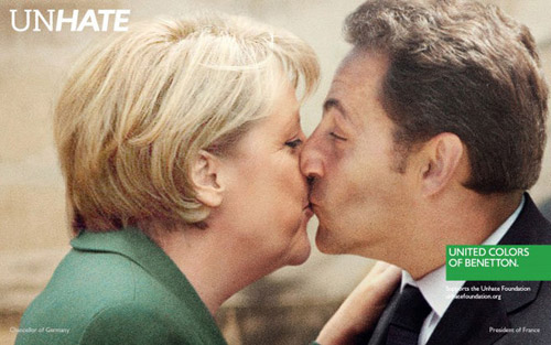 Итальянская марка United Colors of Benetton, известная провокационной рекламой, запустила целую карикатурную кампанию под названием Unhate («Против ненависти»). Постеры с изображением целующихся глав крупнейших государств, в том числе Барака Обамы и Уго Чавеса, лидеров Северной и Южной Кореи, Ангелы Меркель и Николя Саркози, Махмуда Аббаса и Биньямина Нетаньяху, призывают к отказу от ненависти. Политики отнеслись к карикатурам довольно спокойно, однако духовенство было менее терпимым. Кадр с изображением поцелуя папы римского Бенедикта XVI и египетского имама Ахмеда ат-Тайиба после резкой критики Ватикана запретили для размещения на щитах и публикации.