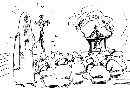 В тувинской газете «Риск» была опубликована карикатура на патриарха Кирилла. Сам по себе рисунок довольно безобиден: патриарх стоит с крестом над сидящими на коленях прихожанами. При этом все прихожане одеты как буддистские монахи. Карикатура и текст статьи указывают на то, что православных людей в Туве осталось крайне мало, их вытеснили лица коренной национальности, в массе своей разделяющие шаманистские, буддистские, ламаистские взгляды.
