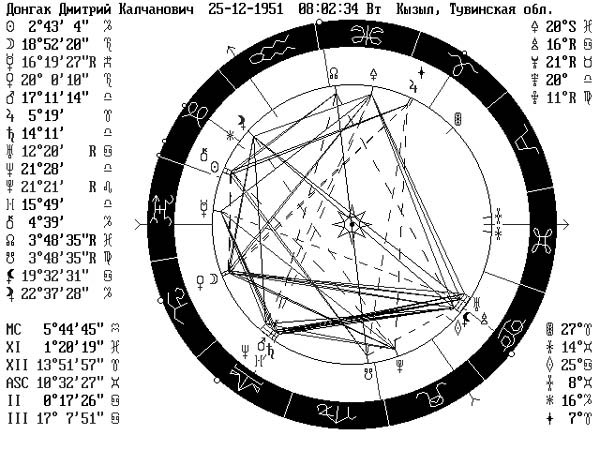 Поскольку Ооржак уходящий политик, мы не будем подробно останавливаться на личных качествах его гороскопа, тем более, что прошлой весной мы это уже делали. Мы предложим прогноз его жизни на ближайший месяц и проанализируем его взаимоотношения с возможными кандидатами на должность Председателя Правительства РТ.