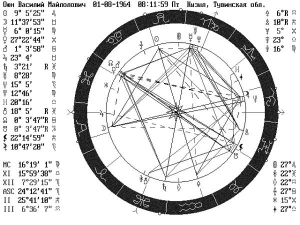 По совокупности показателей – самый слабый гороскоп из всех трех. Большие амбиции, но неумение самостоятельно их реализовывать. В сексуальном плане человек слабее, чем Ооржак, но сильнее, чем Донгак. Человек решительный, даже чересчур. Неумение быстро мыслить и хорошо говорить продиктовано оппозиционным расположением Меркурия и Сатурна. Удивленно-простоватое выражение лица продиктовано оппозиционным расположением Белой Луны, а также квадратуры Белой Луны к Солнцу и Луны к Солнцу. Негативное отношение Василия Майлоловича ко всем женщинам определяется оппозиционным расположением Солнца и Вакшьи. Оюн не умеет делать долгосрочные расчеты и выработать долгосрочную стратегию. Но при этом упорен и даже упрям.