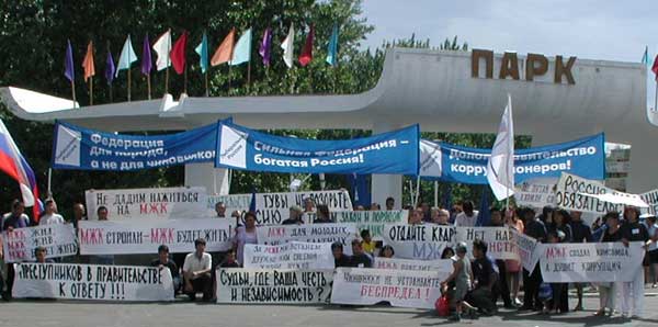 Характерны были лозунги МЖК-овцев на митинге: «Судьи, где же Ваша честь и независимость?!», «МЖК жил, жив и будет жить!», «МЖК строил, МЖК будет жить!», «Чиновники в правительстве! Не устраивайте беспредел!» и другие. Затем пошли выступления рядовых членов «Либеральной России», которые с гневом говорили о правовом беспределе в России, о развале экономики и социальной сферы, о преступности. Как позже выяснилось, в Тувинском Белом Доме как раз во время митинга заседало правительство РТ и встречалось с командированными в Туву представителями Администрации Президента России В.Путина. Так что представители Федерального Центра воочию увидели протест против беспредела, творящегося в вотчине «демократа»-премьера РТ Ш.Ооржака. И тувинская милиция, зная заведомо о прибытии московских «гостей», была чрезвычайно предупредительна и вежлива. Милиционеры предложили пройти митингующим по улице Ленина в направлении Национального парка и устроить митинг там. Организаторы митинга согласились, памятуя, что у входа в парк как раз многолюдно.