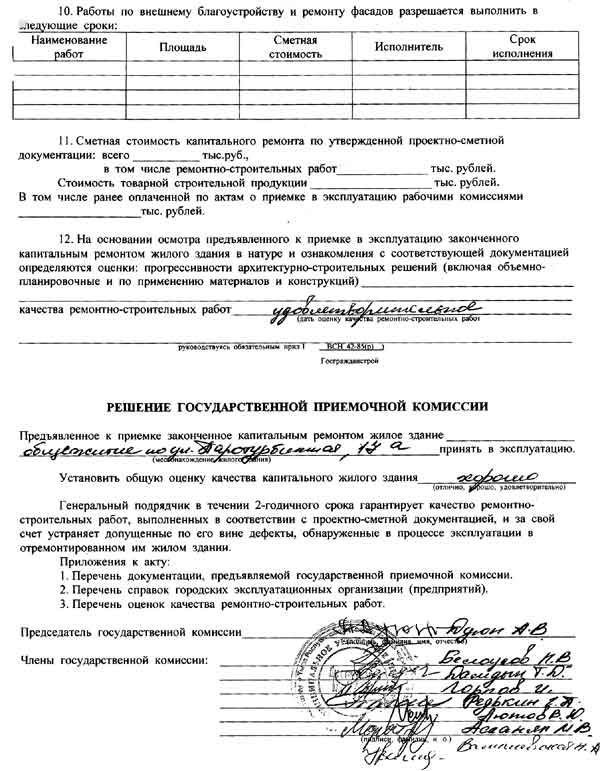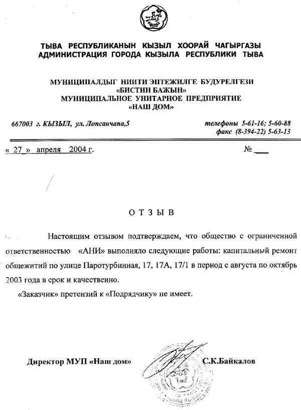 Из акта приемки следует, что 20 ноября 2003 года Госкомиссия под председательством гл.инженера МУП «Наш Дом» Дуюна А.В. приняла капитальный ремонт общежития и инженерных сетей, признав качество работы «удовлетворительным» с оценкой качества жилья на «хорошо». Но назвать документом эти три страницы бумаги язык не поворачивается: в роли заказчика, эксплуатационной организации и генподрядчика числятся сразу три представителя МУП «Наш дом» – Белоусов, Дамдын и Горнов, проектной организации – строительное ООО «АНИ» в лице Асланяна, а орган санитарного надзора представлен ООО «Хорай» в лице Лютого. Этакий междусобойчик. Собрались друзья-соратники, подписали и закусили. Но самое главное – в акте нет подписи представителя госпожнадзора.