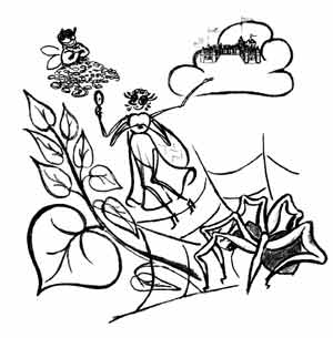 А неподалеку Паук восьмиглазый паутину плел. Увидел Муху, подполз поближе, думает, как бы эту вертихвостку в свои сети поймать. Заметив такое пристальное к себе внимание, Муха даже жужжать перестала от счастья. Села на травинку, и давай выбирать, кто из двух господ ей больше подходит, с кем жизнь вольготнее: «Паук, конечно, солидный мужчина. Все при нем, дело свое есть, доходы, видать, немалые. Одно плохо – летать не может. А мне простор нужен! Вот полечу я, нацепив новые изумрудные крылышки, все мошки так и попадают в траву от зависти! – мечтает шестилапая. – А как одной лететь-то? Нет, уж лучше господин Овод. Он и статен, и высокого полета насекомое. Рядом с таким спутником я буду особенно хороша! Вот летим мы над лугом, он в сером костюме, я в новых золоченых крылышках, а все знакомые смотрят и зеленеют от зависти! А он глядит только на меня, а я ни на кого не гляжу, я лечу, лечу все выше и выше! Надо хорошо подготовиться. У Овода связи, знакомства. Естественно, и званые обеды, и рестораны. А там блеск общества, звон золота! Надо только в нужное время оказаться в нужном месте. Вот, например, Овод улетел по делам, а я одна. Вечер, скукота, и я лечу в казино, что в дупле старого дуба. Я вся в мехах, с бокалом вина, слежу за игрой прекрасного незнакомца. Он выигрывает огромную сумму денег, но вдруг его глаза встречаются с моими. Он моментально забывает обо всем, он очарован. Мы пьем росистое шампанское, кружимся в ритме прекрасного медленного танца. Завораживающая мелодия уводит нас все дальше и дальше в страну страсти... Да, Овод, конечно, неплох. Но разве может он сравниться с моим новым возлюбленным. Ах, господин Шмель, ах, моя мечта! Жизнь рядом с ним рай. Цветочные дворцы принадлежат ему. Мы сидим с ним на большой приемной поляне. Я вся в бриллиантах! Насекомые летят к нам на поклон, все смотрят на меня и просто умирают от зависти! А я...».