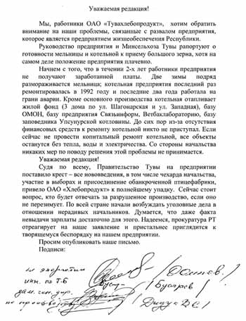 Мы, работники ОАО «Тувахлебопродукт», хотим обратить внимание на наши проблемы, связанные с развалом предприятия, которое является предприятием жизнеобеспечения Республики.