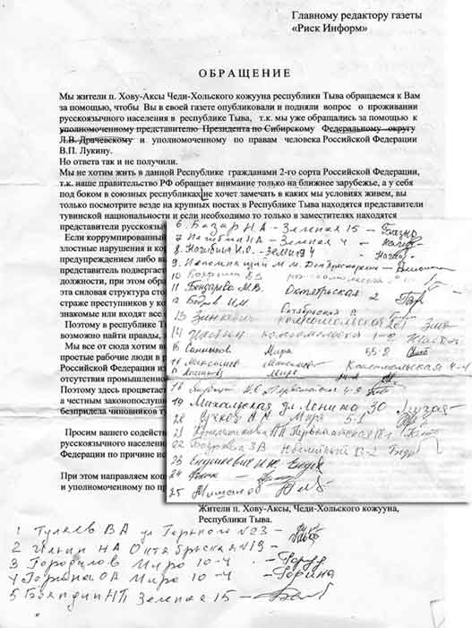 Мы, жители п. Хову-Аксы Чеди-Хольского кожууна Республики Тыва, обращаемся к Вам за помощью, чтобы Вы в своей газете опубликовали и подняли вопрос о проживании русскоязычного населения в Республике Тыва.