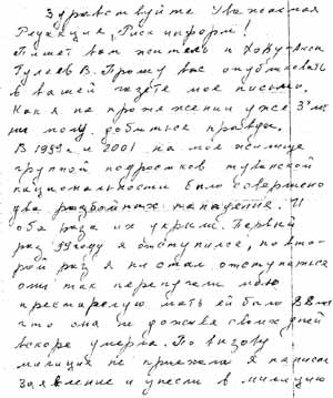 В дальнейшем я пишу в Генпрокуратуру и МВД России. По поводу укрывательства милицией и Прокуратурой. Но оба заявления приходят сюда в Прокуратуру, и опять получаю отписки. В июле этого года я второй раз написал в Генпрокуратуру и просил, чтобы они прислали проверяющего, так как Прокуратура укрывает следователей и прячет заявления.