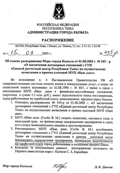 Но затащить в ЕРЦ Калиндуу удалось только МУП «Наш Дом». При этом ЕРЦ ничего нового не изобрел, а лишь взял в аренду имущество МУПа и его точки сбора платежей. По сути – поднанялся у МУПа. Мало того, контора под руководством зятя Монгуша Калиндуу оказалась жуликоватой: невзирая на все заверения принимать и аккумулировать платежи научилась быстро, – а вот возвращать их законному хозяину не спешила.