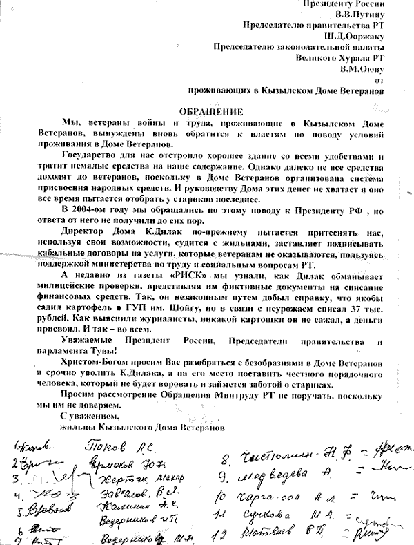 Мы, ветераны войны и труда, проживающие в Кызылском Доме Ветеранов, вынуждены вновь обратится к властям по поводу условий проживания в Доме Ветеранов.