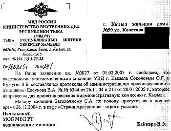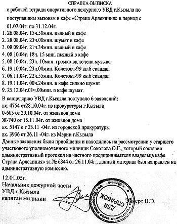 Практически с первого дня в кафе, не заботясь о том, что оно находится в жилом доме, стали включать громкую музыку, в связи с чем мы обратились в администрацию г.Кызыла и получили оптимистичный ответ от заместителя мэра по строительству Саая О.С., что «хозяину кафе выписано предупреждение» (№2025 от 17.07.2003 г. на входящий №4223 от 03.07.2003 г.).