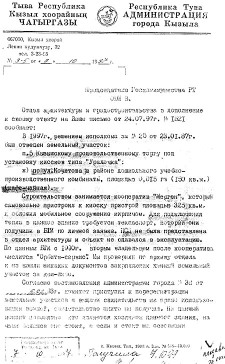 Однако вскоре у Госкомимущества появилось желание узаконить объект. В связи с этим даже появилось обращение к главному архитектору г.Кызыла. И 7 октября 1997 года был получен ответ за №3-5, в котором говорится, что отсутствует проектно-сметная документация на строительство объекта, и на самом деле он является всего лишь типовым киоском «Уралочка», а кроме того кооператив «Мерген», осуществлявший строительство, самовольно «пристроил к киоску пристрой площадью 325 кв. м. и обложил мобильное сооружение кирпичом. Объект не сдавался в эксплуатацию». И еще, что архитектура г.Кызыла «не нашла никаких документов, закрепляющих данный земельный участок за кем-нибудь».