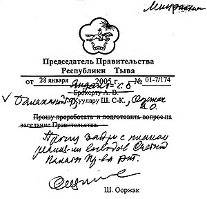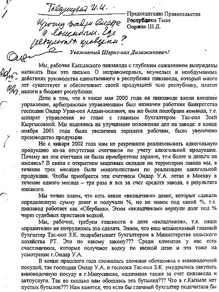 А ещё народные вестители сообщают Ш.Ооржаку о странных взаимозачетах пивзавода с ООО «Третье тысячелетие», которое в зачёт асфальтирования и сооружения проходной получило водку по цене ниже себестоимости. А также спрашивают с Шериг-оола Дизижиковича, куда подевалась новая «десятка» Волжского автозавода, изъятая в счёт долга с того же ООО «Третье тысячелетие».