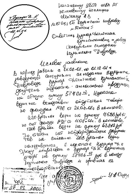 Так, 3 апреля 2002 года по материалам УБЭП МВД РТ было возбуждено уголовное дело 2-474/02 в отношении зав. акцизным складом К., у которой якобы была установлена недостача продукции завода на сумму в 7 тыс. рублей. Простенькое дело мариновали два года, а затем прекратили по п.2 ч.1 ст.24 УПК РФ – за отсутствием состава преступления. А к миллионным убыткам у правоохранителей почему-то интереса нет...