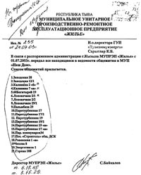 По закону, подстанции и другое имущество должны были взять себе на баланс республика и Кызыл. Но не взяли, – видимо, побоявшись хлопот. Поэтому только в столице по сведения энергетиков 25 бесхозных электроподстанций, за которыми никто не смотрит и, как правило, не платит за потребленное электричество. Дело в том, что к этим подстанциям подключены различные общежития барачного типа былых предприятий, малопригодные для проживания в связи с ветхостью и часто административные здания этих предприятий, превращенные самовольщиками в некое подобие общежитий. Проживающие в них понятия не имеют, что такое оплата за свет; к тому же нередко никто не знает, кто фактически проживает в той или иной комнате.