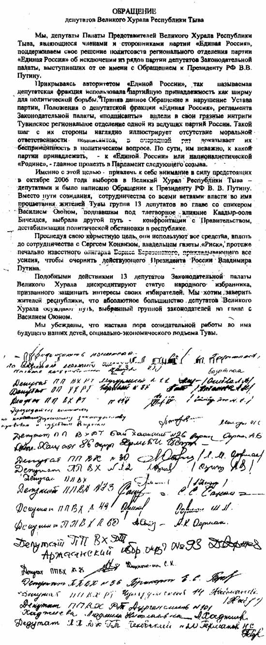 Отрицательные герои Обращения конкретны и узнаваемы. Обозначены и должности, и фамилии. Тринадцать подписантов, спикер Василий Оюн, Каадыр-оол Бичелдей, Сергей Конвиз... Удивление вызывает частое употребление имени Президента России Владимира Путина.