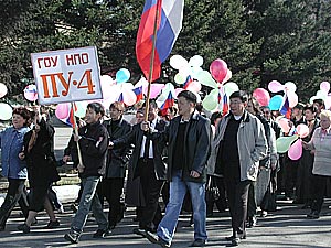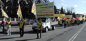 В 10 утра нестройная колонна без музыкального сопровождения стихийно начала движение в сторону площади Арата. Милиция была начеку и сопровождала праздничное шествие до места проведения митинга. Выделялась своим ярким оформлением колонна Тувинского регионального отделения общероссийской партии «Патриоты России». Э.Наксыл и его «духовный» заместитель А.Хоюгбан профессионально подошли к организации политического действа. Их колонна выделялась из оставшихся простеньких колонн своим ярким оформлением и организацией. Откуда-то появились и сторонники «Аграрной партии», правда, без своего трижды судимого предводителя.